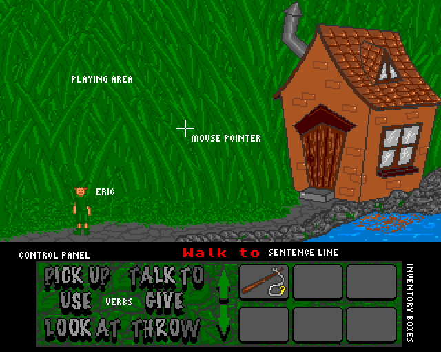 The Playing ScreenThe Legend of the Elves is controlled using the mouse only. The mouse controls the cross hair pointer which is used to select objects and actions on the screen. The playing screen is split into two main parts; The Playing Area (showing Eric's current location) and the Control Panel (containing the Verbs and Inventory). The majority of the screen is taken up by the Playing Area - this is where you see where Eric is and where the game takes place. Below the Playing Area is the Sentence Line where sentences are formed to control Eric. Below the Sentence Line is the Control Panel. The Control Panel contains the actions (verbs) which are used to control Eric (such as Pick Up, Look At etc.) and the Inventory Boxes which show what Eric is carrying. Eric can carry a maximum of 18 items at any one time. The arrows at the side of the Inventory Boxes are used to navigate around the inventory (you can only see 6 of the 18 inventory boxes available at any one time) See Using the Control System for more information.