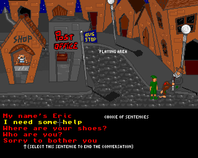 Talking to Other Characters There are many characters in The Legend of the Elves that you can talk to. Sometimes, they may not want to have a conversation with you but most of them will. When you initiate a conversation with a character, the Control Panel will be overwritten by a choice of sentences for Eric to say. Simply select which sentence you want Eric to say with the left mouse button, and Eric will proceed to say this sentence. The choice of sentences will change as the conversation continues. Sometimes, you can have a conversation with a character and then talk to them again later when your choice of sentences may have changed. You shouldn't think that once you have spoken to a character, you won't need to talk to them again. They may provide some important clues the next time around!![]()